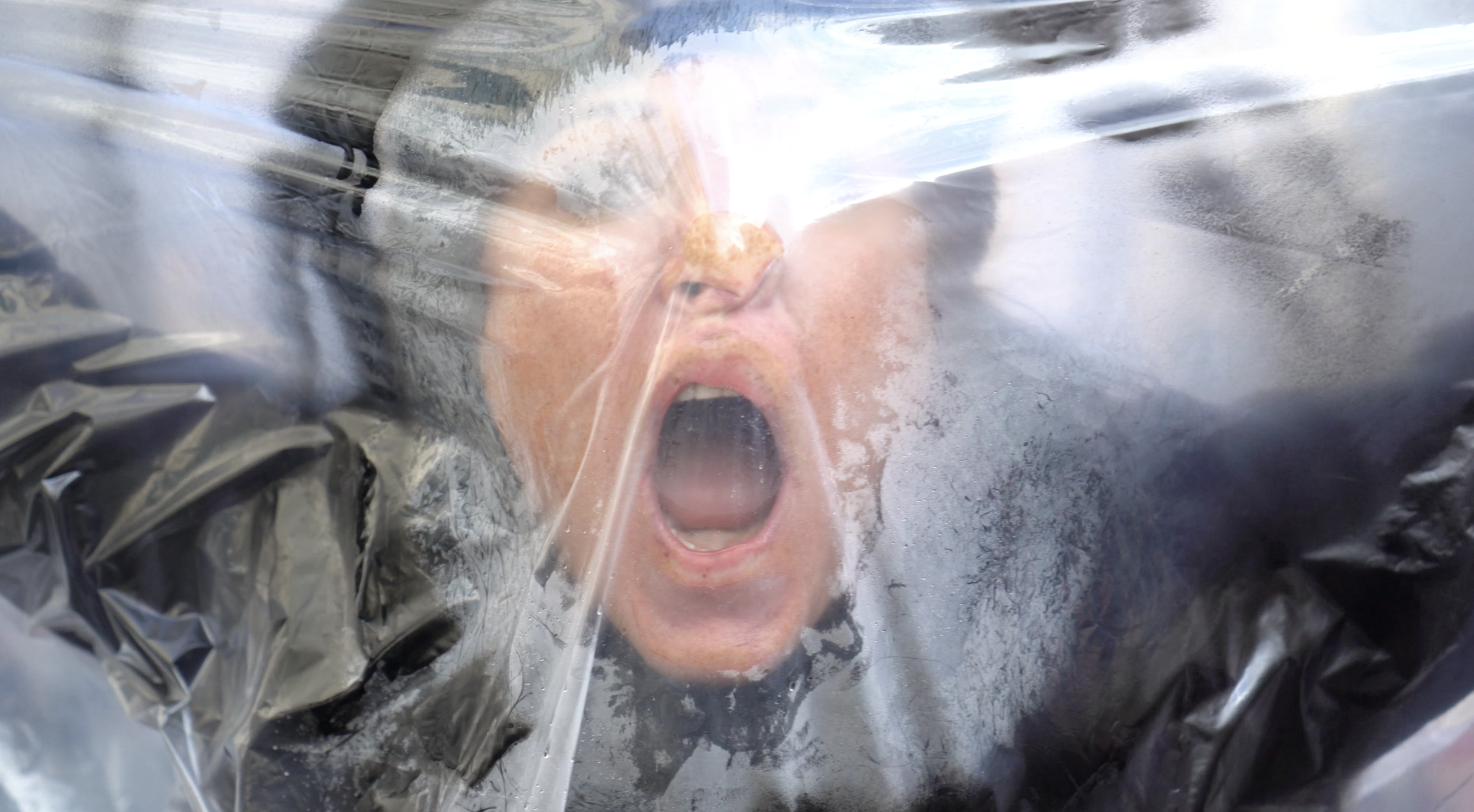 As they advance, some performers are tied up and suffocated in clear plastic, sealed with red tape, their gasping and desperate movements visible but contained within the transparent layers of plastic. The plastic clings to their bodies, representing the suffocating grip of violence—the loss of agency, breath, and life. Their struggle becomes a physical manifestation of the stifled voices of civilians caught in the crossfire of political and military aggression.